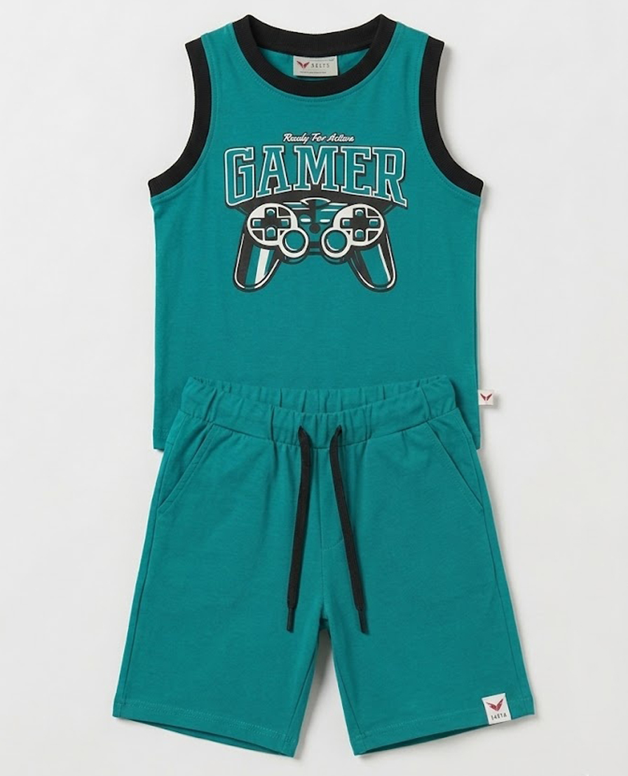 Made for little gamers on the move, this co-ord set brings fun and comfort together. The bold “GAMER” graphic with controller motif adds a playful touch, while the sleeveless design keeps it light and breathable. With easy-fit shorts and a flexible waistband, it’s perfect for energetic days and relaxed moments alike.
