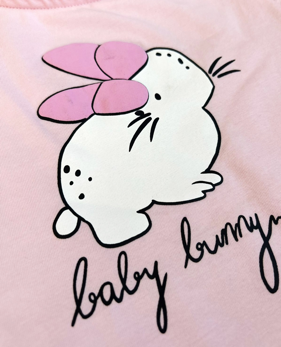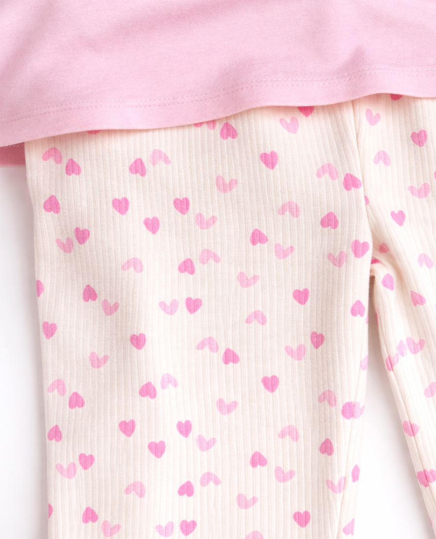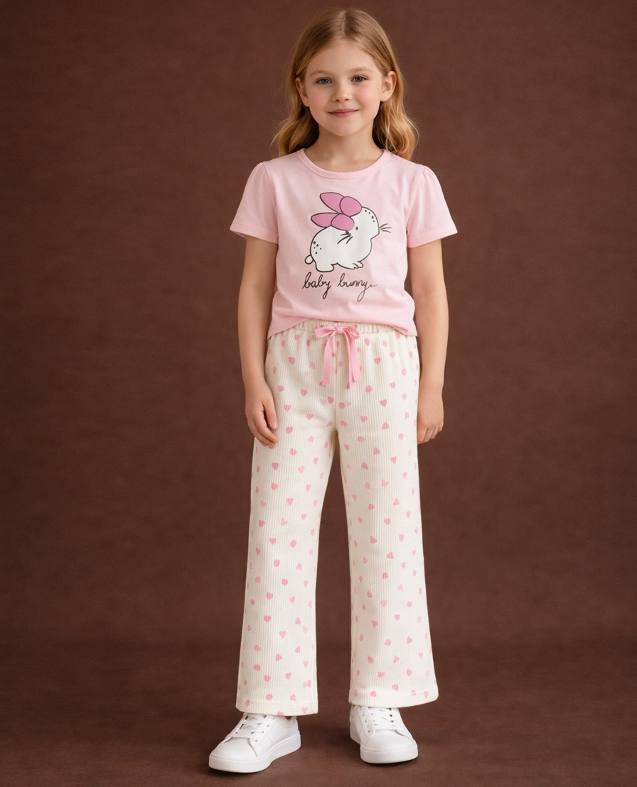 Thoughtfully designed for comfort and cuteness, this pastel co-ord set brings together soft textures and playful elements. The top showcases a sweet bunny motif highlighted with a puff print bow detail, adding dimension to the artwork. The coordinated ribbed trousers feature an all-over heart print with a relaxed straight fit and elasticated waistband for ease of movement. Ideal for  all-day wear, this set combines functionality with a gentle, premium aesthetic.